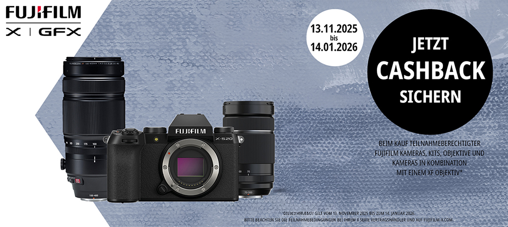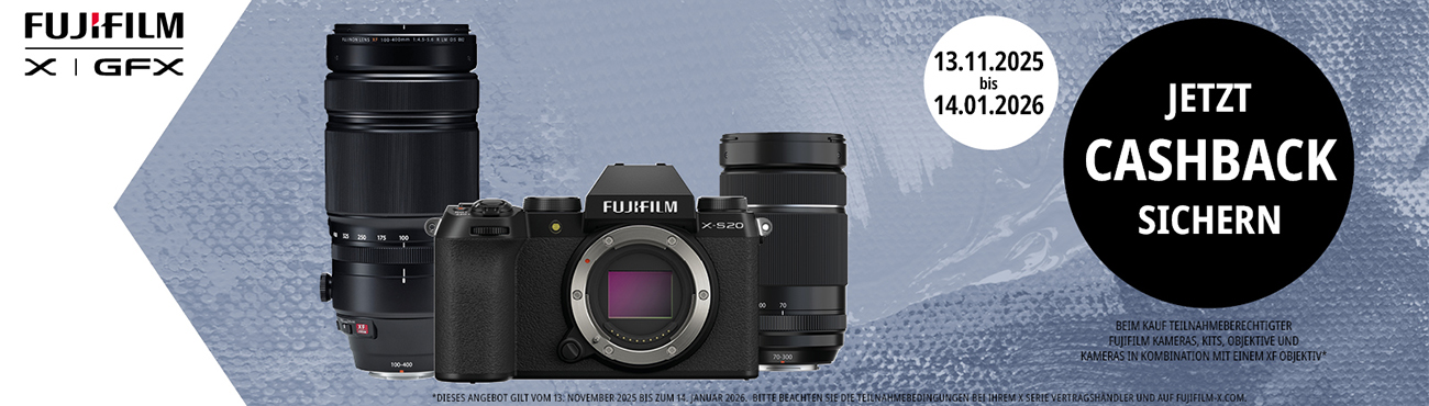 Sichern Sie sich jetzt bis zu € 400,- Cashback beim Kauf ausgewählter FUJIFILM Kameras, Kits und FUJINON XF Objektive. Es ist die perfekte Gelegenheit, in das legendäre FUJIFILM X System einzusteigen oder Ihr bestehendes Equipment aufzurüsten!So einfach funktioniert die Cashback-Aktion: